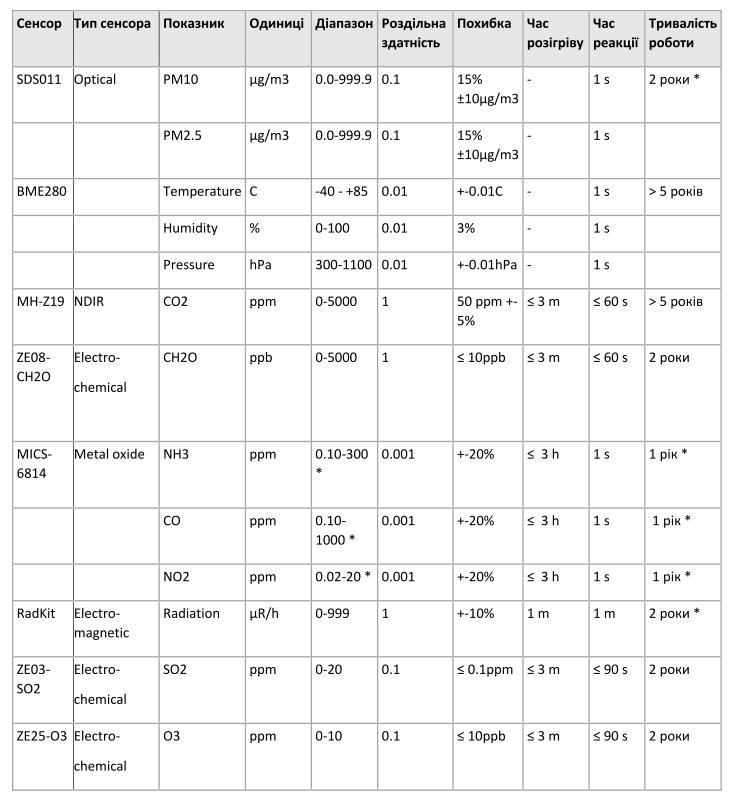 Специфікація сенсорів: