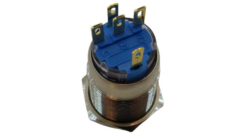 • Контакти: 2 положення, 3 контакти: 1 загальний COM, 2 на замикання та розмикання, (позначення на корпусі: NO-COM-NC) + 2 контакти підсвічування(позначення на корпусі: +,-)