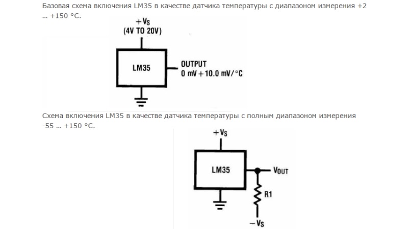 Низький вихідний опір, лінійне значення вихідної напруги і прецизійна калібрування роблять датчик LM35 вкрай зручним для підключення до вимірювальних ланцюгах. Датчик може використовуватися як з однополярним напругою живлення, так і з двох полярним. У зв'язку з тим, що датчик споживає струм лише 60 мкА, у нього дуже низький рівень власного розігріву, менше ніж 0,1 ° C при нерухомому повітрі. Датчик LM35 допускає роботу в діапазоні температур -55 ... +150 ° C, LM35C працює в діапазоні -40 ... +110 ° C (від -10 ° C з поліпшеною точністю). LM35 випускається в корпусі TO-46, датчики LM35C, LM35CA і LM35D - в корпусі TO-92. Для LM35D можливі також виконання в корпусах SO-8 і TO-220.