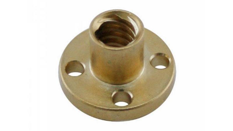 Т-подібна гайка для трапецієподібного гвинта T8*2mm. Для чотиризахідного гвинта з кроком 8мм. Габарити гайки (висота х діаметр): 15*22мм. Диаметр монтажних отворів - 3.5мм. Матеріал - латунь.