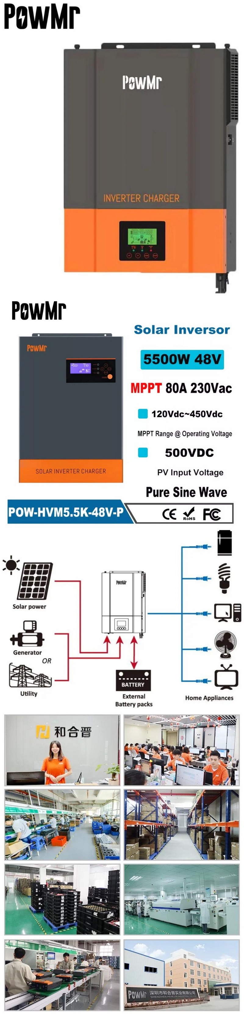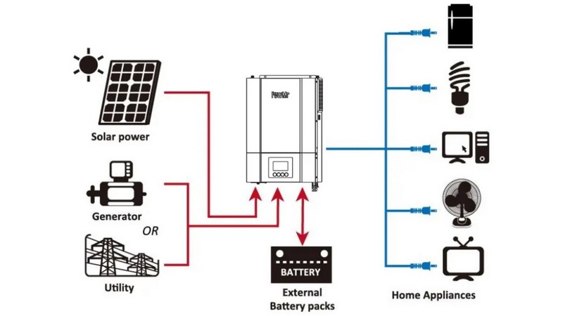 Це багатофункціональний інвертор/зарядний пристрій, який поєднує в собі функції інвертора, сонячного зарядного пристрою та зарядного пристрою для акумулятора, щоб забезпечити підтримку безперебійного живлення з портативним розміром. Його РК-дисплей пропонує настроювані користувачем і легкодоступні кнопки, такі як зарядний струм акумулятора, пріоритет змінного/сонячного зарядного пристрою та прийнятну вхідну напругу на основі різних програм.