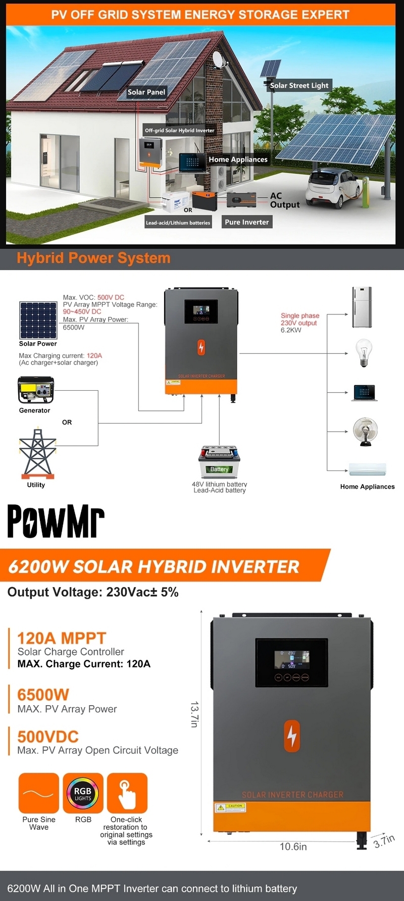 Гібридний інвертор чиста синусоїда PowMr 6.2KW 48V 220V 120A MPPT POW-HVM6.2M-48V. Гібридний сонячний інвертор PowMr6,2 кВт, мережевий інвертор із чистою синусоїдальною хвилею, 48 В 230 В PV, макс. вхід, 500 В постійного струму, MPPT 120 A, зарядний пристрій.