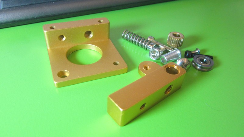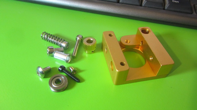У підставі і важелі блоку є наскрізні отвори для закріплення термобарьерамі, а так само отвори для кріплення блоку на двигуні і установки регулювальних гвинтів з пружиною. Підстава і важіль головки виконані з якісного алюмінієвого сплаву пофарбованого в бронзово-золотистий колір. Зібрана головка блоку виконує роль механізму подачі пластика. Зверху на головку закріплюється система охолодження, що купується окремо. Ця картина може служити як окремою частиною при по-елементному зборі принтера або як елемент на заміну до екструдеру MK8.