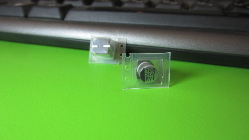 Електролітичний конденсатор напругою 25V і номіналом 100uF. Розмір конденсатора -  6.3*7.7mm.