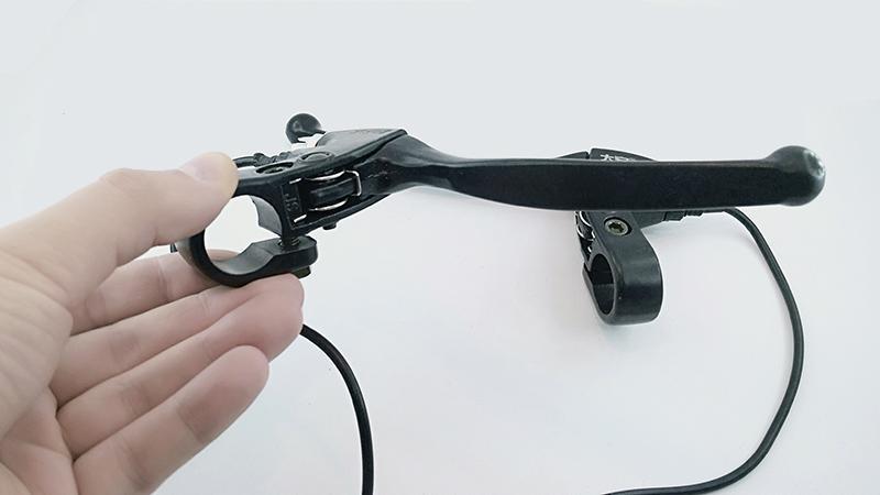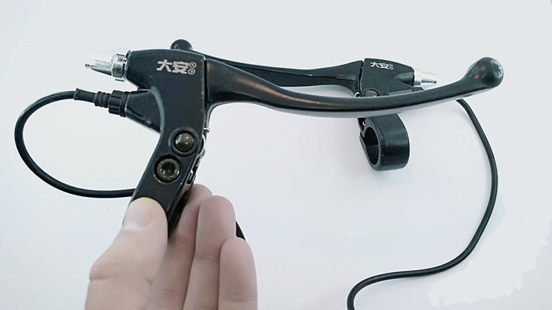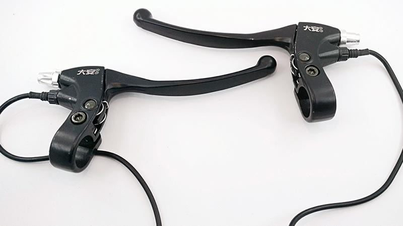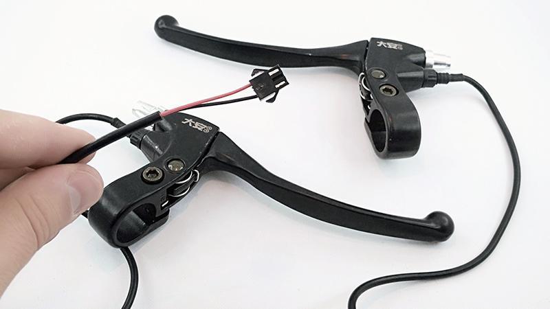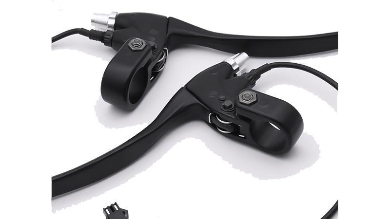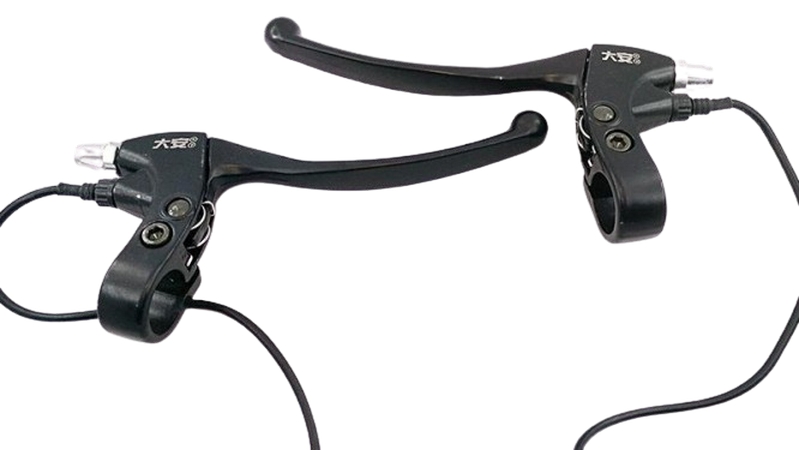 Комплект гальм гальма для електровелосипеда. Ручки гальма з датчиками відключення мотор колеса або електродвигуна, призначені для миттєвого відключення подачі живлення на електропривод при гальмуванні. Ручки гальма з датчиками відключення, використовуються на електровелосипед, електроскутерах, електросамокатах, Електроквадроцикл, електромотоцикли і другом легкому електротранспорті, обладнаному кермом велосипедного типу.