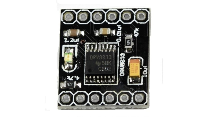 Модуль управління колекторними двигунами на основі мікросхеми DRV8833. Драйвер являє із себе два H-моста, здатні управляти 2-ма (або одним, при об'єднанні) колекторними двигунами або одним кроковим двигуном. Два канали управління з заявленим струмом 1,5 А. (рекомендований струм 1,2А на канал) і високою робочою напругою 2,7 ... 10,8 В. Плата ідеально підходить для роботи з невеликими малопотужними електродвигунами.
