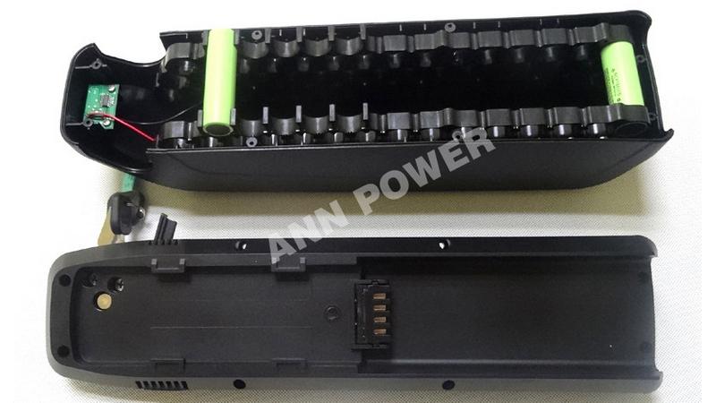 Корпус батарея для електровелосипеда Li-Ion. У комплект не входить сам акумулятор і БМС, тільки корпус з кріпленнями. Решту можна додатково дозамовити на нашому сайті. Пластик корпусу батареї досить твердий. Розміри корпусу, кількість елементів, які можна туди встановити, а також комплектація показані на фото. Якщо потрібна додаткова інформація, - перед покупкою уточнюйте. У корпусі передбачений USB роз'єм, який герметично закривається гумовою заглушкою. Для роботи цього роз'єми потрібен перетворювач напруги (на практиці помістити досить важко). Роз'єм зарядного пристрою у вигляді XLR plug. Батарея в цьому корпусі виходить знімна. Площадка кріпитися до рами, а на площадку вже встановлюється сам корпус. Знімання відбувається за рахунок зсуву. Для фіксація від довільного зсуву і від крадіжки, служить замок з ключами. Кріплення до рами передбачено за допомогою двох болтів. Вони зміцнюють площадку до рами в отвір кріплення під вело пляшку. Кріплення площадки посилено залізякою, яка вставляється в пази. Щоб не подряпати раму, в комплект входять гумові прокладки. Оскільки зібрана батарея важить близько 4 кг. Контакт батареї і площадки виконаний у вигляді роз'єму. Перфорація елементів 18650 виконана у вигляді пластикової пластини з отворами. Саме щільне розташування цих отворів дозволило вмістити в корпусі потрібну кількість елементів. Розмір під установку БМС досить обмежений прилеглими елементами 18650.