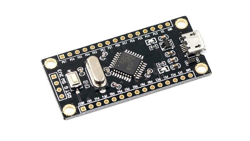 Плата для розробки STM8S STM8S105K4T6S. STM8S105K4T6S оснащениа шістнадцятьма кілобайтами флеш-пам'яті, одним кілобайт EEPROM і двома кілобайтами оперативної пам'яті. Тактова частота - 16 МГц. Його можна порівнювати з ATmega328 / 168, що використовуються в Arduino Nano, Pro Mini, UNO.