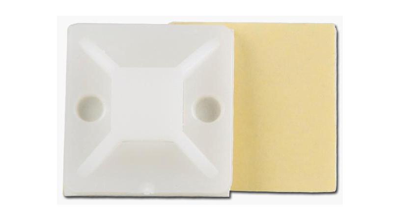 Площадка для кріплення стяжок на липучці 40*40мм бежева. Такі майданчики забезпечують швидкий і зручний монтаж без застосування спеціальних інструментів і порушення цілісності поверхні. Клейова основа забезпечує надійне кріплення. Матеріалом виготовлення являестя поліамід 66 (нейлон), який відрізняється високою міцністю, термостійкістю, стійкістю до дії нафтопродуктів, мастильних матеріалів, огранічних розчинників і т.д. і володіє хорошими електроізоляційними властивостями. У верхній частині є спеціальні отвори з чотирьох сторін для протягування стяжок. Площадки можна додатково зафіксувати за допомогою саморізів або цвяхів.