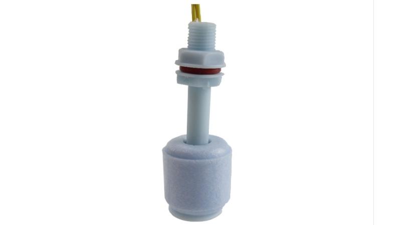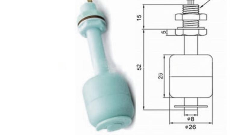 Поплавковий датчик перемикач рівня води вертикальний. Розмірні характеристики вказані на рисунку. Поплавковий датчик рівня води Arduino використовується в проектах, де необхідно виміряти рівень рідини в резервуарі. Дані датчики недорогі і одні найнадійніших пристроїв для вимірювання рівня рідини. Всередині поплавкового датчика розміщений круглий магніт. Шток являє собою порожню пластикову трубку з розташованими всередині герконами. Поплавок з закріпленим магнітом завжди розташовується на поверхні рідини. Підходячи до геркона, поле магніту викликає спрацьовування його контактів, що є сигналом про заповнення ємності до певного обсягу. При послідовному з'єднанні контактних пар між собою через резистори можна постійно стежити за рівнем води за загальним опором ланцюга. Стандартний сигнал при цьому змінюється від 4 до 20 мА. Датчик рівня води найчастіше розміщується у верхній частині резервуара на ділянці довжиною до 3 м. Як датчик можна використовувати? Даний датчик можна використовувати в проектах, в яких необхідно зафіксувати момент підняття рівня рідини до певної позначки. Після спрацьовування датчика можна приводити в дію насос, включати сигнал тривоги та інше.
