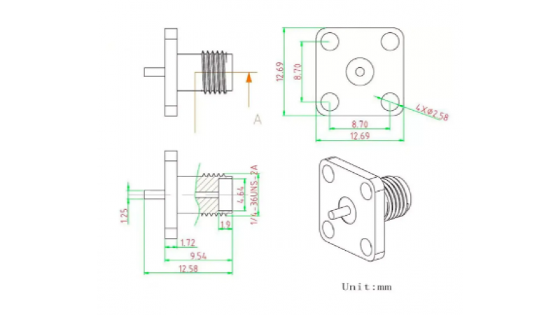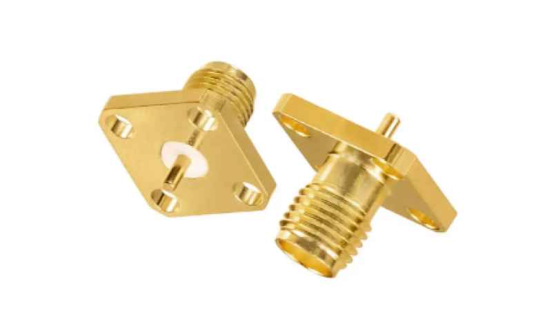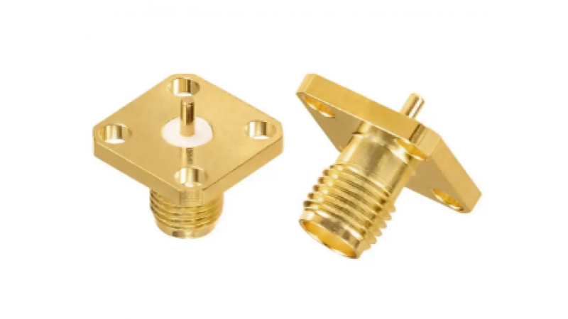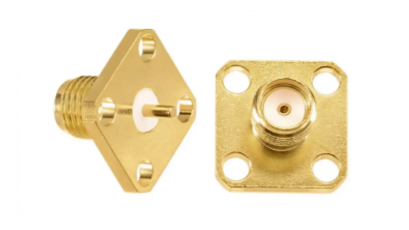 Роз'єм монтажний SMA Female квадратний SMA-KFD-3 призначений для підключення виносних антен і кабелів до передавача або приймача. Гніздо має 4 отвори в корпусі і закріплюється на панелі за допомогою гвинтів (немає в комплекті). Центральний пін монтується на центральну жилу кабелю методом пайки.