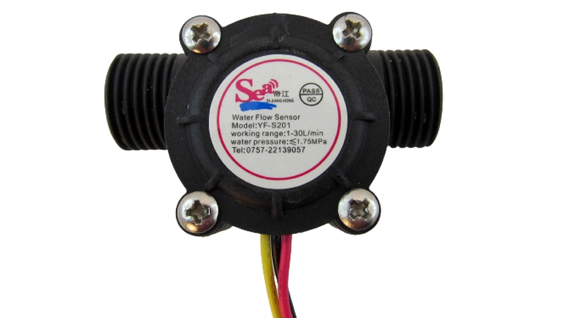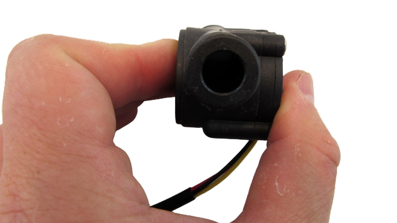 Датчик потоку води складається з пластикового клапана з двома штуцерами з різьбленням ½ дюйма, водного ротора і датчика Холла. Коли вода проходить крізь датчик, ротор обертається зі швидкістю пропорційною швидкості потоку води. Датчик Холла фіксує кожен оборот і передає отриманий сигнал.
