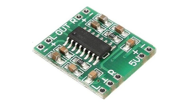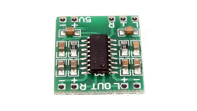 Стерео аудіо підсилювач 2х3W D-класу на базі PAM8403. Вихідна потужність 2х3Вт, при напрузі живлення 5В, навантаженні 4Ом PAM8403 2х3Вт стерео підсилювач D-класу. Низький коефіцієнт нелінійних спотворень дозволяє одержати високу якість звучання при достатній вихідної потужності. Нова, безфільтрові архітектура PAM8403 з безпосереднім підключенням динаміків, тим самим значною мірою знижує обв'язку і схему в цілому (і вартість). Ефективність сучасних підсилювачів D-класу набагато вище аналогових (АВ-класу) практично з тим же якістю звучання, основне застосування - портативна електроніка з автономним живленням (акустичні системи в ноутбуках, планшетах, моніторах, переносних телевізорах ...).