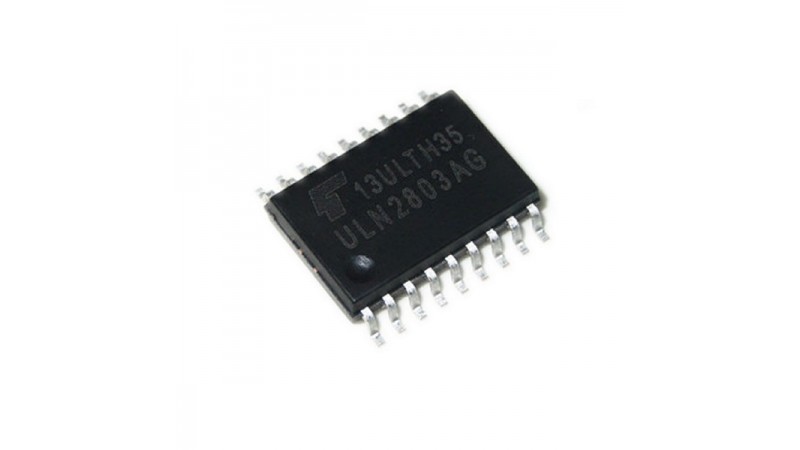 ULN2803AG - 8-канальний масив транзисторних ключів за схемою Дарлінгтона. Мікросхема ULN2803A узгоджена з вхідним рівнями з ТТЛ або 5-вольтовими КМОП мікросхемами, а на виході має потужні високовольтні транзисторні ключі з відкритим колектором.